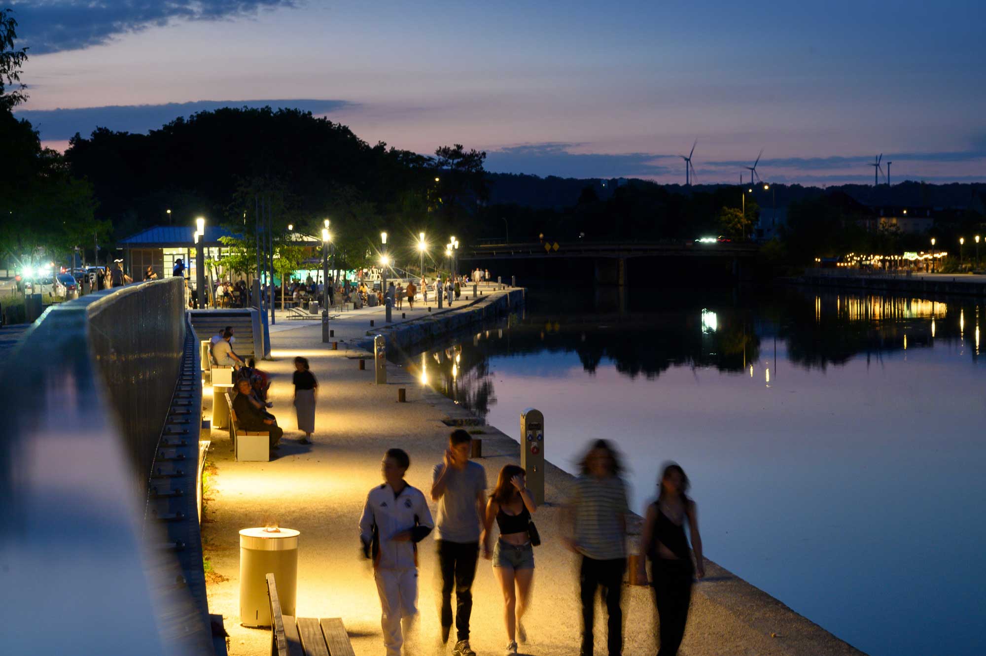 Les berges de l’Aisne ont fait l’objet d’une requalification ambitieuse. Entre port de commerce, espaces de promenade, lieux de loisirs et événements festifs, elles accueillent aujourd’hui une diversité d’usages : promeneurs, cyclistes, activités fluviales et commerçants se partagent un cadre naturel et vivant.